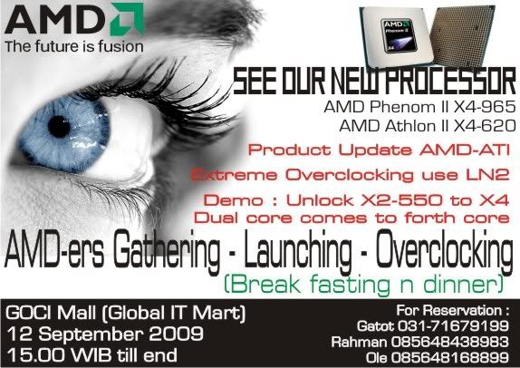 Sabtu-Minggu, 12-13 September, kembali Gerombolan AMDers Surabaya (GANAS) mengadakan gathering sekaligus bubar (buka bareng) di Golden City Mall – Global IT Mart, Surabaya. Acara ini bersamaan dilakukan di 3 kota besar lainnya yaitu Jakarta, Bandung, dan Yogyakarta. Dengan tema AMD’erz LN2 Party yang sekaligus launching processor terbaru AMD, yaitu Phenom II X4 965 Black Edition (3.4GHz) dan Athlon II X4 620 (2.6GHz).